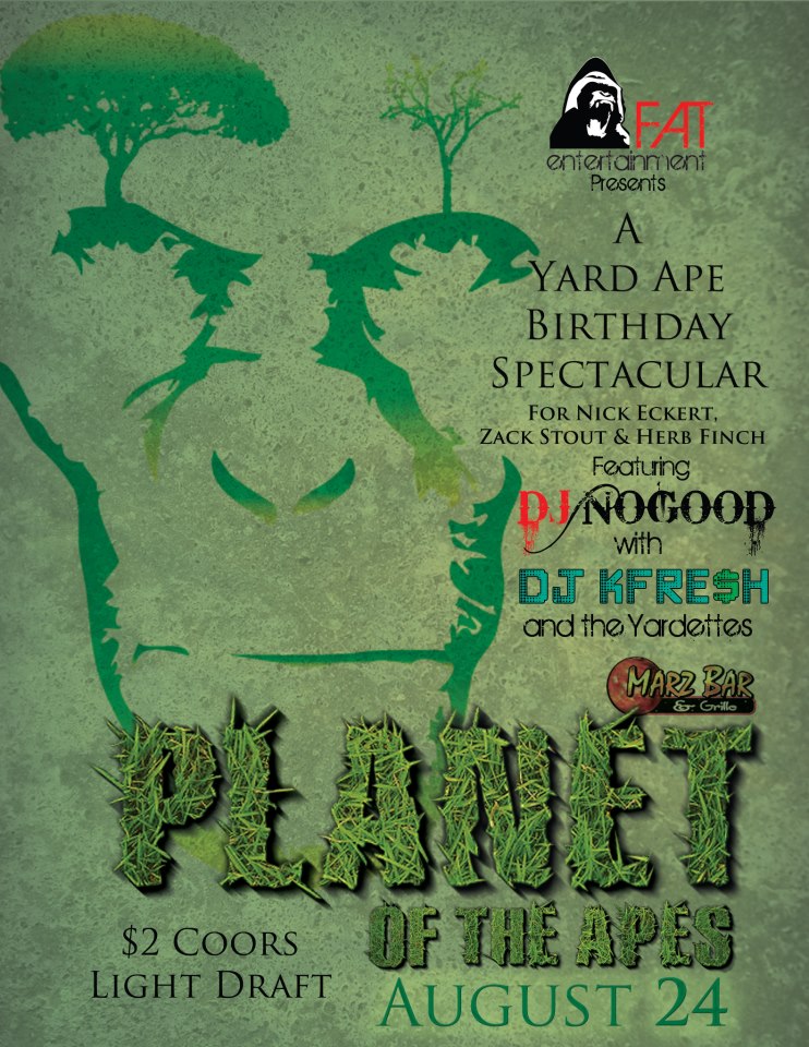 To kick off The #FnAwesomeWeekend to celebrate F.A.T. Entertainment’s (@FnAwesomeTime) 1st Anniversary we bring you The Planet Of The Apes Birthday Bash with DJ NoGood & KFre$h at Marz Bar in Phillipsburg, NJ. DJ NoGood (@deejaynogood) & DJ KFre$h (@Kfresshhh) will be teaming up for a few special birthday surprises. This is also the BIRTHDAY CELEBRATION for “Yard Apes” UncleFatty Says, Zack Stout & Herbie Finch. Last years birthday party was off the wall so you know we’re going to top it this year.