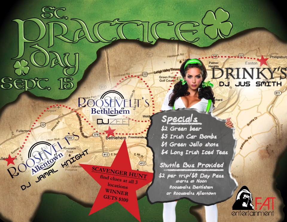 The St. Practice Day SCAVENGER Hunt at Drinkys @DrinkysPA & Roosevelt’s 21st (@Roosevelts21st) Bethlehem & Allentown with DJ June (@djjune1), DJ Jamal Knight (@djjamalknight), Jus Smith (@djjussmith) & F.A.T. Entertainment (@FnAwesomeTime). Shot by Matthew Blum of Lightly Salted Productions. This event was an all day, knock down, drag out, shit show. We almost killed a leperchaun….seriously