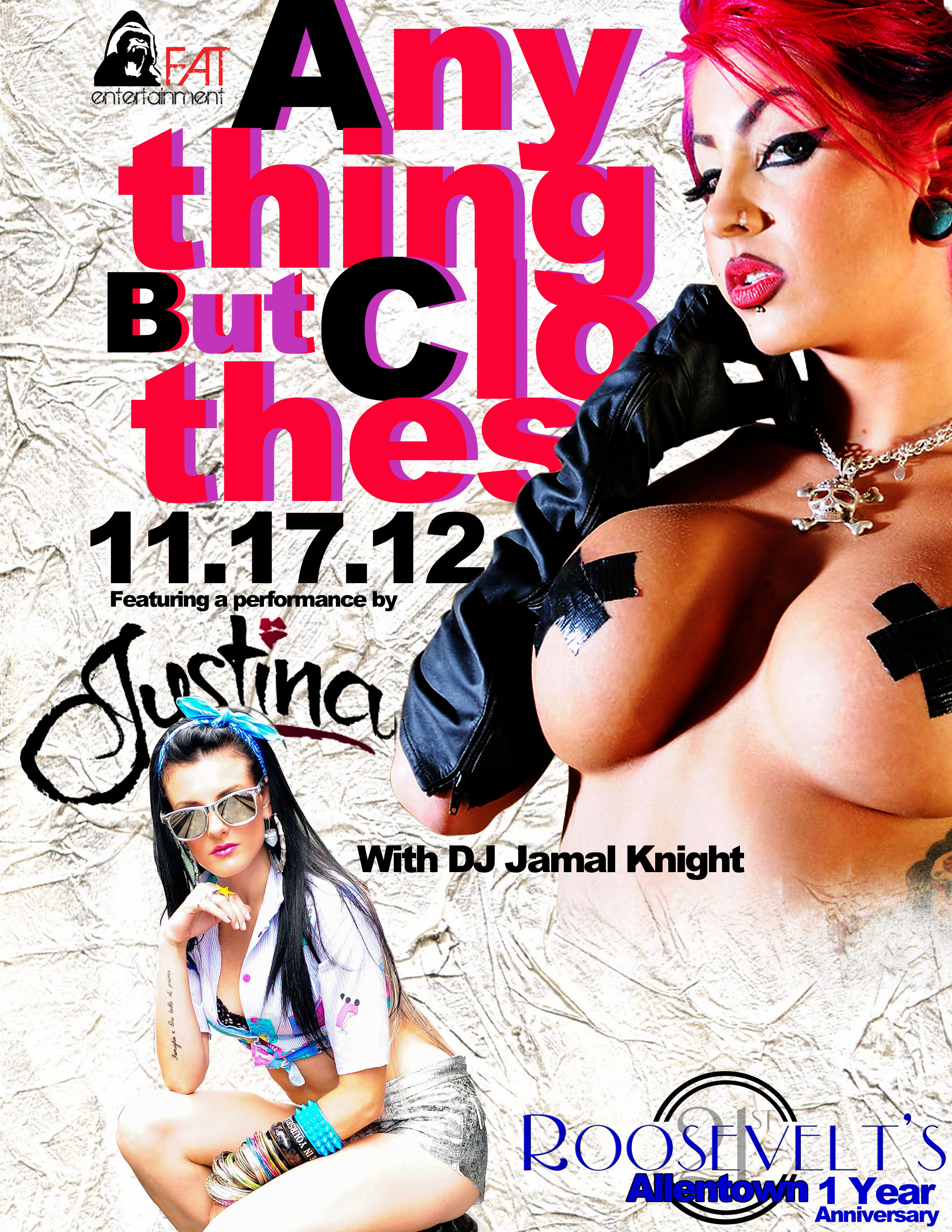 Saturday November 17th is F.A.T. Entertainment’s ANYTHING BUT CLOTHES Party with Justina & DJ Jamal Knight at Roosevelt’s 21st Allentown and we promise this will be one of our most ridiculous parties yet. F.A.T. Entertainment (@FnAwesomeTime) returns to Roosevelt’s 21st Allentown (@Roosevelts21st) with Justina (@JustinaMusic) and DJ Jamal Knight (@djjamalknight). Drink Specials and a VERY COOL SECRET will be released THIS WEEK!! Keep a look out!