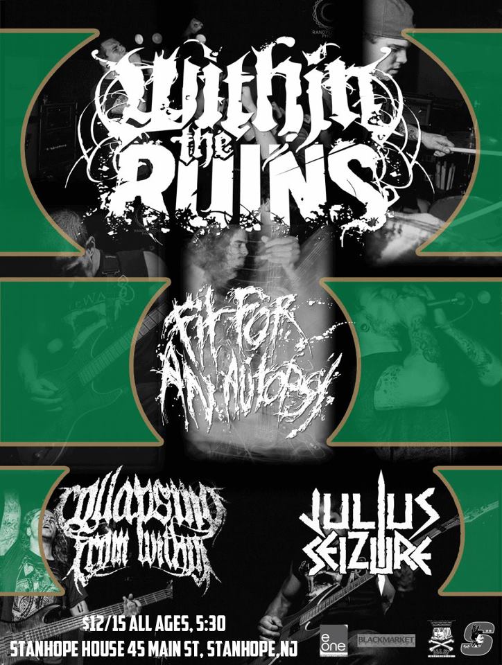 Wednesday December 12th THEY’RE BACK LIVE! Julius Seizure with Within The Ruins & Fit For An Autopsy at The Stanhope House at 5:30 PM. JULIUS SEIZURE goes on around 6. $12 if you grab tickets in advance $15 at the door. What better right after a long work day then some stress relieving, high energy, brutal fucking metal?…..I’ll wait.